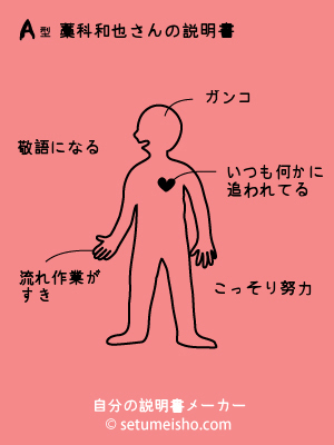 ケンブリッジの森の藤原さんのブログと、HPの事で色々と相談に乗ってもらっている新派堂の植松さんのブログに、「自分の説明書」というサイトの紹介があったので早速自分も挑戦。